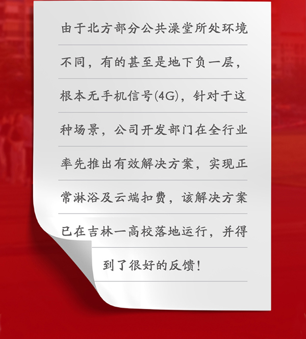 由于北方部分公共澡堂所處環(huán)境不同,有的甚至是地下負(fù)一層,根本無手機(jī)信號(4G),針對于這種場景,公司開發(fā)部門在全行業(yè)率先推出有效解決方案,實現(xiàn)正常淋浴及云端扣費,該解決方案已在吉林一高校落地運行,并得到了很好的反饋!